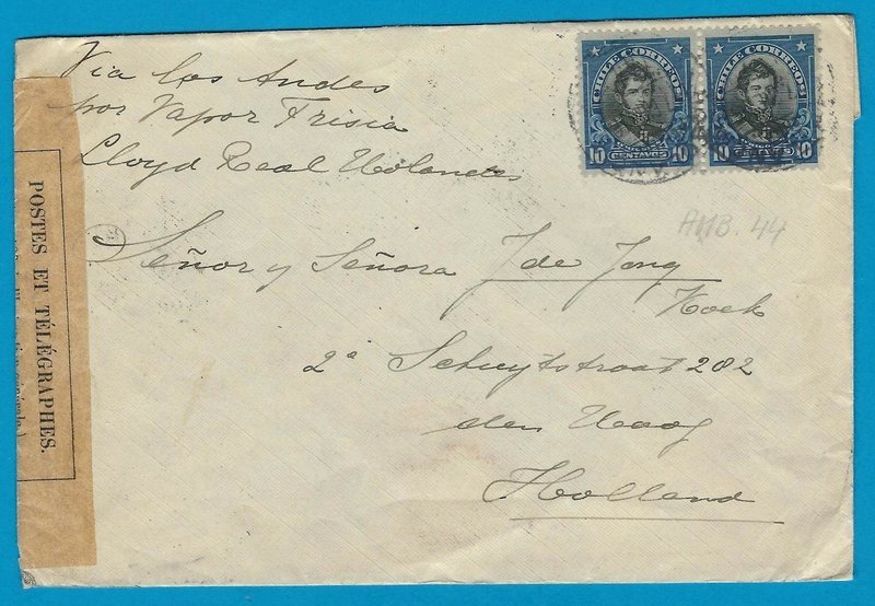 CHILE censored cover 1916 Sn Antonio with Ambulacia 44 to Netherlands